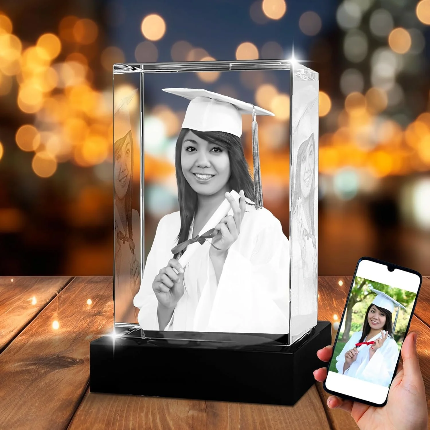 Through state-of-the-art 3D conversion software and laser engraving technology, we can produce a finely detailed portrayal of your photo underneath our beautiful, high-quality crystals. These 3D laser-etched crystal gifts represent exact replicas of your image displayed with surprising realism. The optional light base allows every awesome facet of the etched image to impress.